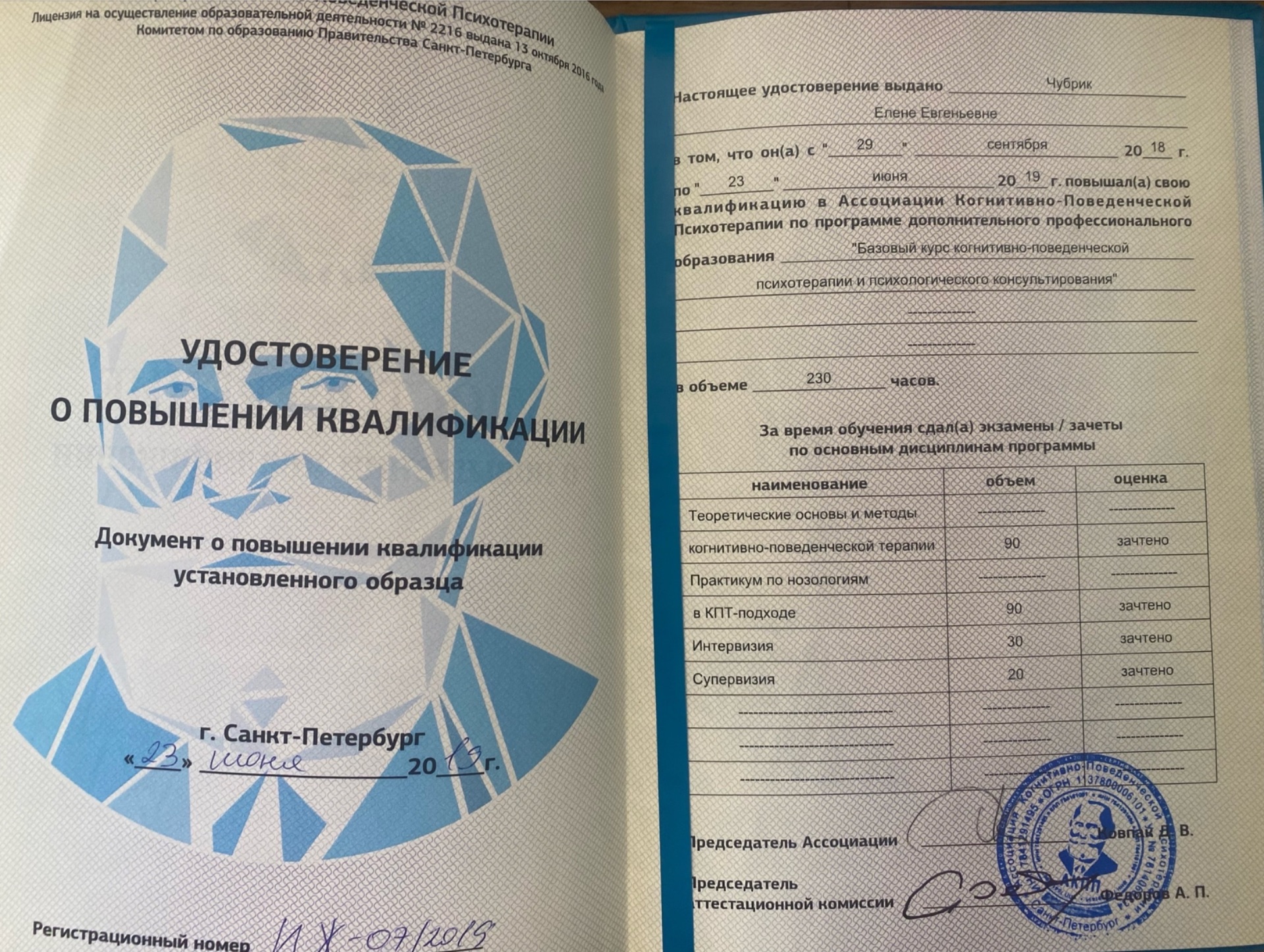 Я обязана регулярно проходить супервизии – консультации с более опытными коллегами по сложным случаям (анонимно!). Это контроль качества моей работы и ваша защита от профессиональных ошибок. Также я постоянно учусь новому. Вы получаете помощь не только от меня, но косвенно – от профессионального сообщества. Работа становится более эффективной и безопасной.